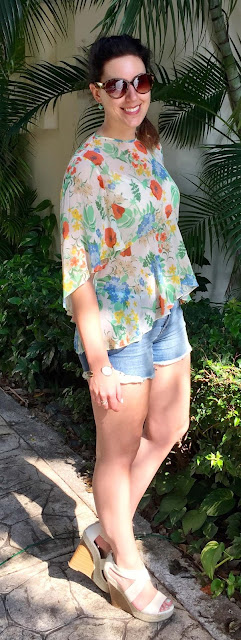 The second look was also worn to breakfast. I chose a pastel floral flowy top and paired it with my cut-off jean shorts and nude wedges. It's always a good idea to bring a couple options that have sleeves. That way, you are covered should the weather be cooler or should you have been the victim of a sunburn. I used protection, so did not burn. But it's better to be prepared!