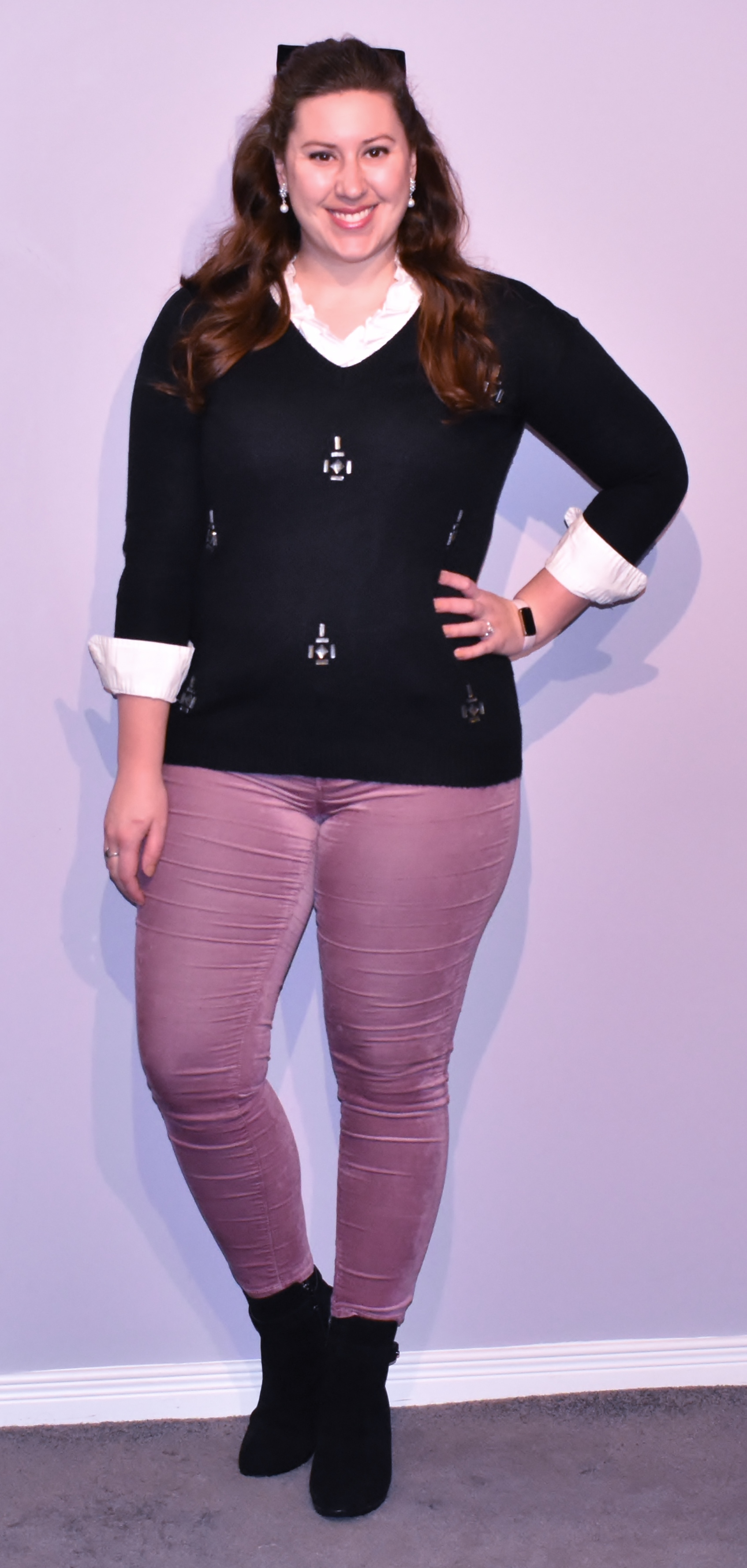 I was inspired to layer my ruffle-trim blouse à la Duchess of Cambridge today. I loved the effect of the peeking white trim from the red blazer and was reminded I have a blouse that would create a similar effect. While the DoC's look was more business, I opted for a softer, casual take. Instead of red, white and black, I swapped out the bold red for blush pink. I also chose a jewelled sweater, snowflake earrings and a velvet bow barrette. I absolutely love the effect of the ruffle collar and this V-neck sweater! It's feminine, preppy and a little unexpected without being stuffy. I'll admit layering was a bit challenging as this blouse has sleeves. My husband had to help me adjust the layers, ha ha! The struggle was worth it though because the result is perfection. However, I am thinking of trying to find a sleeveless option to add to my wardrobe, you know, for ease of layering...