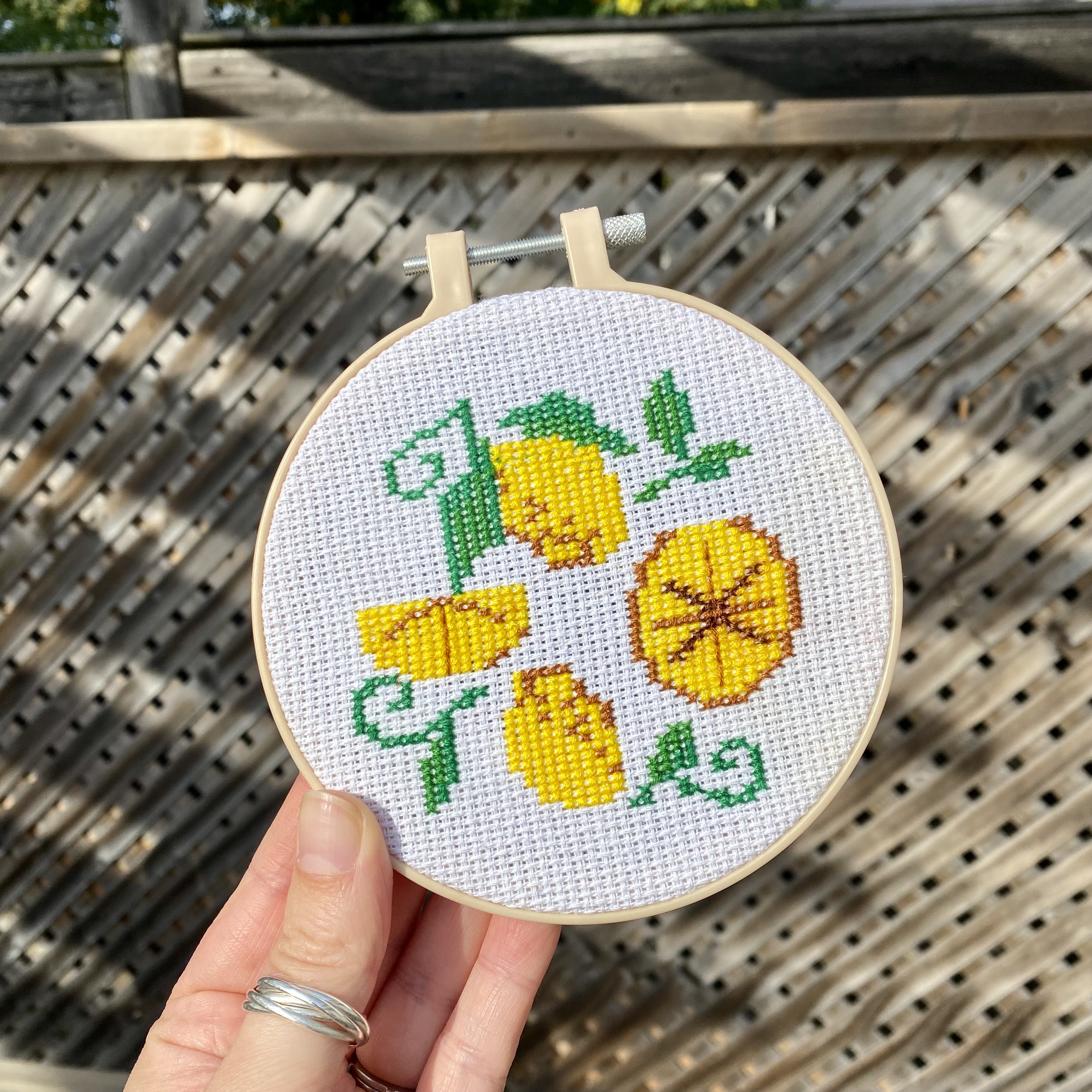 I picked up this lemon cross stitch kit on a whim at the dollar store months ago. I've always been curious about thread art forms, and am no stranger to a needle and thread, so thought it would be a fun little project. Well, I'd almost forgotten about it until I saw it before our vacation in August and decided to bring it with me. I ended up busting out the kit when at my parents and I'm happy I did because my mom was there to help get me started. The instructions were sparse, so her help was very welcome. I struggled a bit at first because I was getting my thread tangled and knotted. Thankfully, my husband is great at undoing knots and turns out his grandma had taught him how to cross stitch, so he also helped me out a lot and gave me great pointers! After sixteen years, we still learn things about one another! The more it went, the better I got at it and managed to finish my lemon cross stitch project. I even ended up improvising a bit and making it my own. I finished it just in time to put it away with my spring/summer décor. I'll display my handy work next year. I would totally do more of this craft, it's definitely relaxing and meditative (once you get the hang of it!)