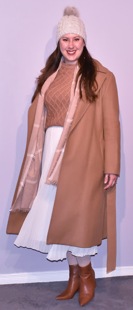 I'm going for a very cozy layered look today, entirely inspired by the humble gingerbread cookie. I love this sweet baked good with its decorative white frosting and find it to be one of my preferred holiday aesthetics. It's simple, classic and really leans into those cozy, comforting, hygge vibes. Very much here for that feeling. I grabbed a mix of cognac and white pieces to make a warm winter look. The pleated skirt brings lightness and movement to the outfit while the cable-knit sweater adds in texture and interest. The outer layer is a matching camel warp coat with beige and white checked scarf and pompom tuque. I absolutely love the result of this outfit and although a departure from my traditional festive dressing, I'm loving the palate cleanse!