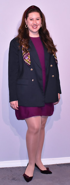 It's still sweater-dress season, so I pulled out my favourite purple dress. I love this sweater dress so much because it's ribbed, which gives it great texture without being too bulky. This means I can layer it - the joy! I added my oversized navy double-breasted blazer for a more laid-back vibe. However, I then draped a printed scarf under the lapel and added some matching velvet pumps. Nude tights and gold hoop earrings complete the chic business-casual outfit. It managed to hit just the right notes of structure, comfort and style. I love when an outfit just comes together so beautifully!