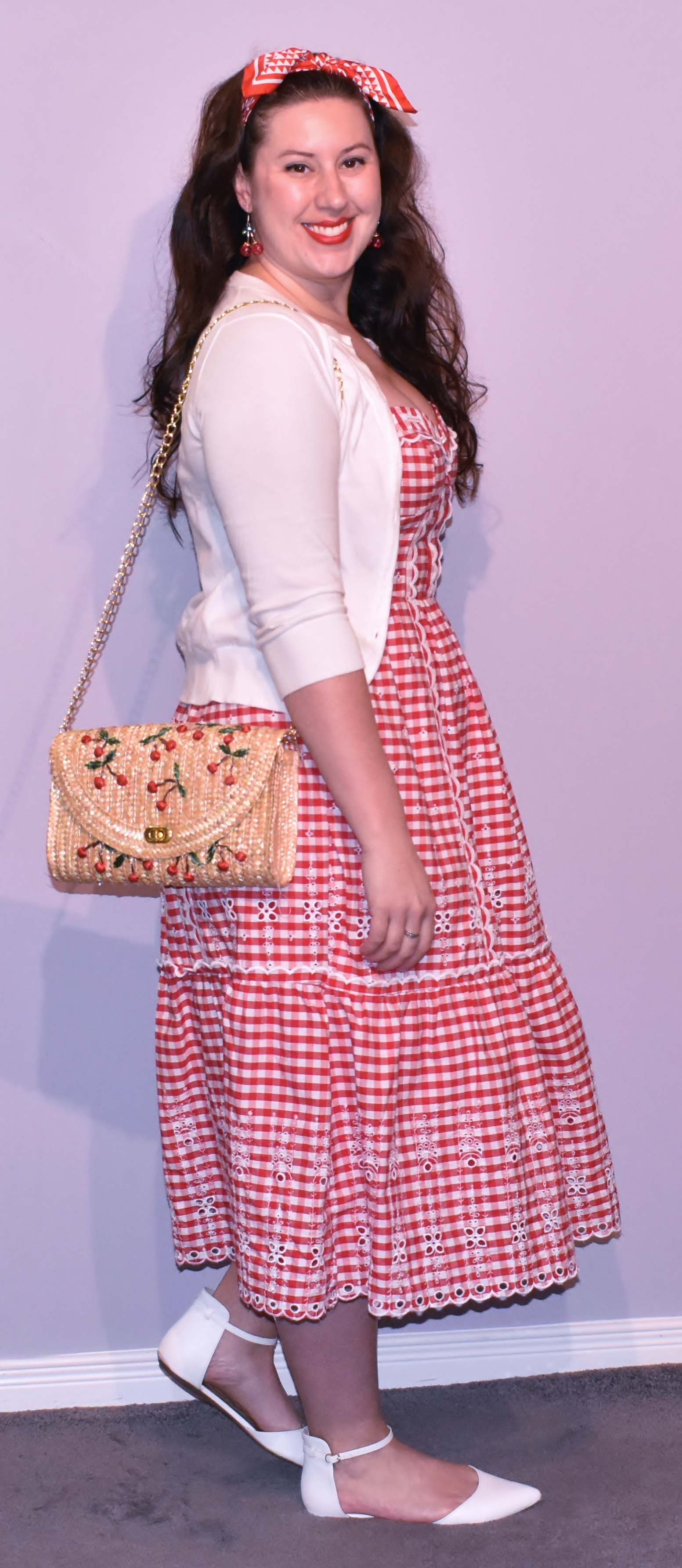 My husband and I went for a little day trip a couple weekends ago. We decided to hit up our favourite little town - Merrickville. We hadn't been in a couple years, so we were overdue. The weather was a bit chilly and overcast, so not ideal but we decided to venture out either way. We got lucky and didn't get rained on. Also, turns out that it was good timing because the town was not busy, we pretty much had the place to ourselves! We had the dog along too because most shops are dog-friendly. She was fed treats almost everywhere we went! I decided to go for the cute picnic look in my red gingham dress with cherry accessories and white cardigan. I felt so darling in this outfit and find the styling was giving off retro vibes. Totally loving that!
